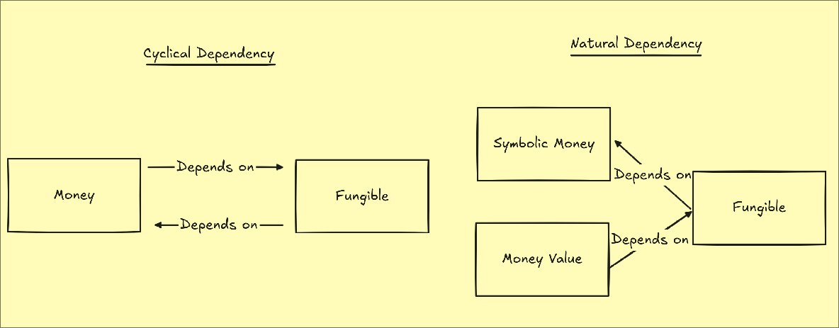 So, if we want to make this concept less-cyclical, then we split money into both its valuable concept and symbolic concept.
